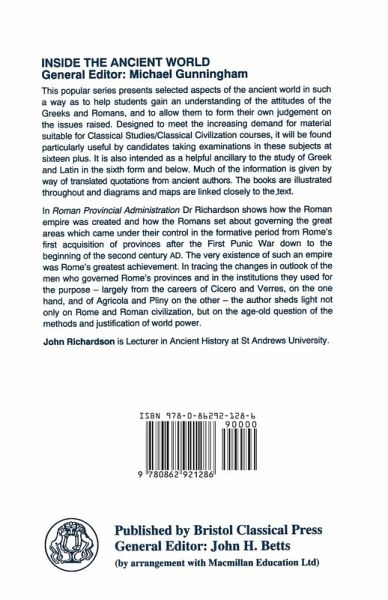 In "Roman Provincial Administration" Dr Richardson shows how the Roman empire was created and how the Romans set about governing the great areas which came under their control in the formative period of Rome's first acquisition of provinces after the First Punic War down to the beginning of the second century AD. The very existence of such an empi9re was Rome's greatest achievement. In tracing the changes in outlook of the men who governed Rome's provinces and in the institutions they used for the purpose - largely from the careers of Cicero and Verres, on the one hand, and of Agricola and Pliny on the other - the author sheds light not only on Rome and Roman civilization, but on the age-old question of the methods and justification of world power. The popular "Inside the Ancient World" series presents selected aspects of the ancient world in such a way as to help students gain an understanding of the attitudes of the Greeks and Romans, and to allow them to form their own judgement on the issues raised. Designed to meet the increasing demand for material suitable for Classical Studies / Classical Civilization courses, it will be found particularly useful by candidates taking examination sin these subjects at sixteen plus. It is also intended as a helpful ancillary to the study of Greek and Latin in the sixth form and below. Much of the information is given by way of translated quotations from ancient authors. The books are illustrated throughout and diagrams and maps are linked closely to the text.