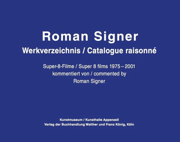 Ein QR-Code gibt Zugang zu mehr als 270 Filmen von einer Laufzeit von 18 Stunden.Das Werkverzeichnis nennt Titel, Jahr, Ort, Kamera und bildet bis zu 8 Filmstills ab, sowie das Kommentar des Künstlers. Das Buch ist der Schlüssel zu einer noch immer zu wenig bekannten Werkgruppe eines erfindungsreichen, experimentierfreudigen und humorvollen Künstlers.Ed. Alexandra Signer, Peter Zimmermann. Kommentiert von/explained by Roman Signer.