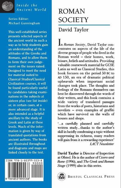 In Roman Society David Taylor concentrates on aspects of the life of the diverse groups of people who lived in the Roman world - their homes, work, leisure, beliefs and attitudes. Providing valuable coursework material for GCSE Latin as well as Classical Studies, this book focuses on the period 50 BC to AD 150, an era of dramatic political upheavals when important social changes took place. The thoughts and feelings of the Romans themselves can best be discovered through the words of their writers, and this book contains a wide variety of translated passages from the works of poets, historians and novelists - even examples of graffiti which have survived on the walls of houses and shops.