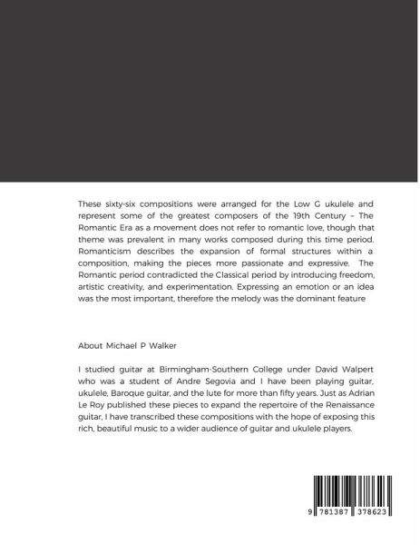 These sixty-six compositions were arranged for the Low G ukulele and represent some of the greatest composers of the 19th Century - The Romantic Era as a movement does not refer to romantic love, though that theme was prevalent in many works composed during this time period. Romanticism describes the expansion of formal structures within a composition, making the pieces more passionate and expressive. The Romantic period contradicted the Classical period by introducing freedom, artistic creativity, and experimentation. Expressing an emotion or an idea was the most important, therefore the melody was the dominant feature