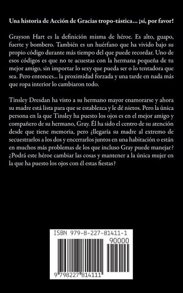 Una historia de Acción de Gracias tropo-tástica... ¡sí, por favor! Grayson Hart es la definición misma de héroe. Es alto, guapo, fuerte y bombero. También es un huérfano que ha vivido bajo su propio código durante más tiempo del que puede recordar. Uno de esos códigos es que no te acuestas con la hermana pequeña de tu mejor amigo, sin importar lo sexy que pueda ser o lo tentadora que sea. Pero entonces... la proximidad forzada y una tarde en nada más que ropa interior lo cambiaron todo. Tinsley Dresdan ha visto a su hermano mayor enamorarse y ahora su madre está lista para que se establezca y le dé nietos. Pero la única persona en la que Tinsley ha puesto los ojos es en el mejor amigo y compañero de su hermano, Gray. Él ha sido el centro de su atención desde que tiene memoria, pero ¿llegaría su madre al extremo de secuestrarlos a los dos y encerrarlos juntos en una habitación o están en muchos más problemas de los que incluso Gray puede manejar? ¿Podrá este héroe cambiar las cosas y mantener a la única mujer en la que ha puesto los ojos con él estas fiestas?