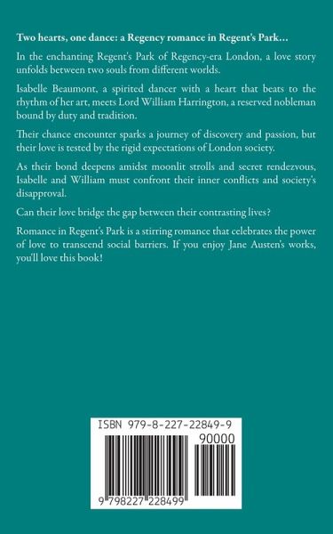 Two hearts, one dance: a Regency romance in Regent's Park... In the enchanting Regent's Park of Regency-era London, a love story unfolds between two souls from different worlds. Isabelle Beaumont, a spirited dancer with a heart that beats to the rhythm of her art, meets Lord William Harrington, a reserved nobleman bound by duty and tradition. Their chance encounter sparks a journey of discovery and passion, but their love is tested by the rigid expectations of London society. As their bond deepens amidst moonlit strolls and secret rendezvous, Isabelle and William must confront their inner conflicts and society's disapproval. Can their love bridge the gap between their contrasting lives? Romance in Regent's Park is a stirring romance that celebrates the power of love to transcend social barriers. If you enjoy Jane Austen's works, you'll love this book!