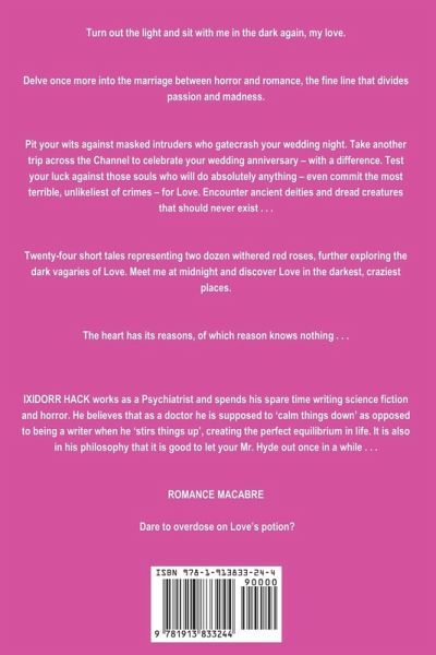 Turn out the light and sit with me in the dark again, my love. Delve once more into the marriage between horror and romance, the fine line that divides passion and madness. Pit your wits against masked intruders who gatecrash your wedding night. Take another trip across the Channel to celebrate your wedding anniversary – with a difference. Test your luck against those souls who will do absolutely anything – even commit the most terrible, unlikeliest of crimes – for Love. Encounter ancient deities and dread creatures that should never exist . . . Twenty-four short tales representing two dozen withered red roses, further exploring the dark vagaries of Love. Meet me at midnight and discover Love in the darkest, craziest places. The heart has its reasons, of which reason knows nothing . . . IXIDORR HACK works as a Psychiatrist and spends his spare time writing science fiction and horror. He believes that as a doctor he is supposed to ‘calm things down’ as opposed to being a writer when he ‘stirs things up’, creating the perfect equilibrium in life. It is also in his philosophy that it is good to let your Mr. Hyde out once in a while . . . ROMANCE MACABRE Dare to overdose on Love’s potion?