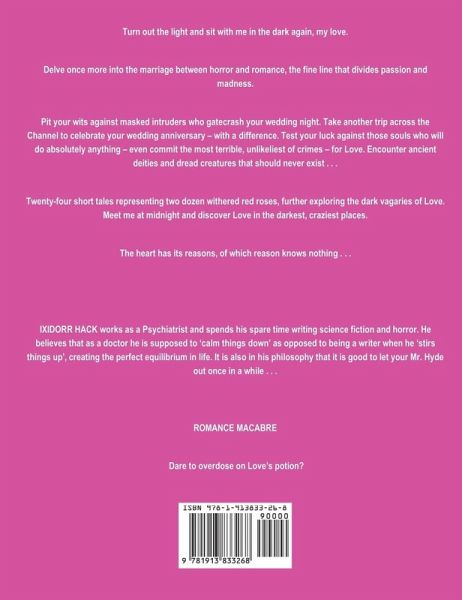 Turn out the light and sit with me in the dark again, my love. Delve once more into the marriage between horror and romance, the fine line that divides passion and madness. Pit your wits against masked intruders who gatecrash your wedding night. Take another trip across the Channel to celebrate your wedding anniversary - with a difference. Test your luck against those souls who will do absolutely anything - even commit the most terrible, unlikeliest of crimes - for Love. Encounter ancient deities and dread creatures that should never exist . . . Twenty-four short tales representing two dozen withered red roses, further exploring the dark vagaries of Love. Meet me at midnight and discover Love in the darkest, craziest places. The heart has its reasons, of which reason knows nothing . . . IXIDORR HACK works as a Psychiatrist and spends his spare time writing science fiction and horror. He believes that as a doctor he is supposed to 'calm things down' as opposed to being a writer when he 'stirs things up', creating the perfect equilibrium in life. It is also in his philosophy that it is good to let your Mr. Hyde out once in a while . . . ROMANCE MACABRE Dare to overdose on Love's potion?