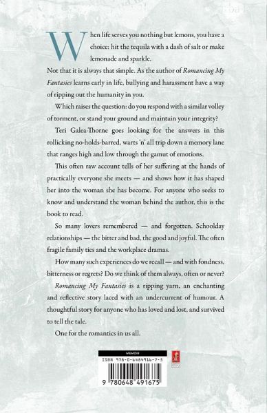 When life serves you nothing but lemons, you have a choice: hit the tequila with a dash of salt or make lemonade and sparkle. Not that it is always that simple. As the author of Romancing My Fantasies learns early in life, bullying and harassment have a way of ripping out the humanity in you. Which raises the question: do you respond with a similar volley of torment, or stand your ground and maintain your integrity? Teri Galea-Thorne goes looking for the answers in this rollicking no-holds-barred, warts 'n' all trip down a memory lane that ranges high and low through the gamut of emotions. This often raw account tells of her suffering at the hands of practically everyone she meets - and shows how it has shaped her into the woman she has become. For anyone who seeks to know and understand the woman behind the author, this is the book to read. So many lovers remembered - and forgotten. Schoolday relationships - the bitter and bad, the good and joyful. The often fragile family ties and the workplace dramas. How many such experiences do we recall - and with fondness, bitterness or regrets? Do we think of them always, often or never? Romancing My Fantasies is a ripping yarn, an enchanting and reflective story laced with an undercurrent of humour. A thoughtful story for anyone who has loved and lost, and survived to tell the tale. One for the romantics in us all.