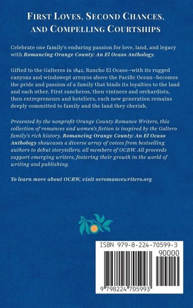 First Loves, Second Chances, and Compelling Courtships Celebrate one family's enduring passion for love, land, and legacy with Romancing Orange County: An El Ocaso Anthology. Gifted to the Galteros in 1842, Rancho El Ocaso-with its rugged canyons and arroyos descending to the Pacific Ocean-becomes the pride and passion of a family that binds its loyalties to the land and each other. First rancheros, then vintners and orchardists, then entrepreneurs and hoteliers, each new generation remains deeply committed to family and the land they cherish. Presented by the nonprofit Orange County Romance Writers, this collection of romances and women's fiction is inspired by the Galtero family's rich history. Romancing Orange County: An El Ocaso Anthology showcases a diverse array of voices, from bestselling authors to debut storytellers, all members of OCRW. All proceeds support emerging writers, fostering their growth in the world of writing and publishing. To learn more about OCRW, visit OCRomanceWriters.org.
