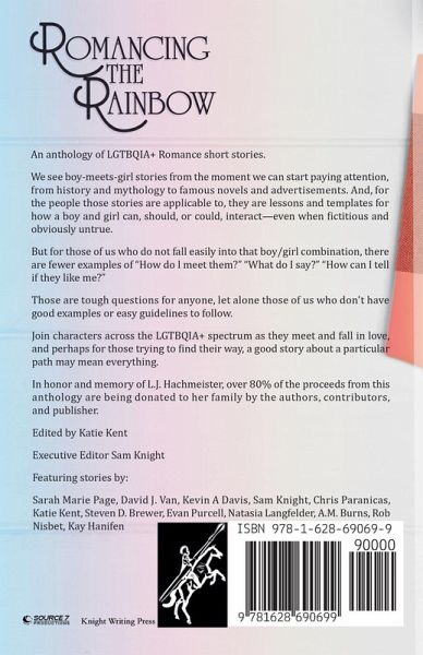 Romancing the Rainbow An anthology of LGTBQIA+ Romance short stories. We see boy-meets-girl stories from the moment we can start paying attention, from history and mythology to famous novels and advertisements. And, for the people those stories are applicable to, they are lessons and templates for how a boy and girl can, should, or could, interact-even when fictitious and obviously untrue. But for those of us who do not fall easily into that boy/girl combination, there are fewer examples of "How do I meet them?" "What do I say?" "How can I tell if they like me?" Those are tough questions for anyone, let alone those of us who don't have good examples or easy guidelines to follow. Join us as we explore Romancing the Rainbow, across the LGTBQIA+ spectrum, and perhaps for those trying to find their way, a good story about a particular path may mean everything. In honor and memory of L.J. Hachmeister, over 80% of the proceeds from this anthology are being donated to her family by the authors, contributors, and publisher. Edited by Katie Kent Executive Editor Sam Knight Featuring stories by: Sarah Marie Page, David J. Van, Kevin A Davis, Sam Knight, Chris Paranicas, Katie Kent, Steven D. Brewer, Evan Purcell, Natasia Langfelder, A.M. Burns, Rob Nisbet, Kay Hanifen