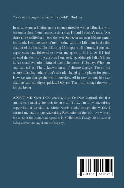 "With our thoughts we make the world" - Buddha. An exciting new small book with a secret message. In what seems a lifetime ago a chance meeting with a Librarian, a Wise Woman, who became a close friend opened a door that I found I couldn't resist. Was there more to life than meets the eye? So began my own lifelong search for Truth. I tell the story of my meeting with the Librarian in the first chapter of this book. The following 17 chapters tell of unusual personal experiences that followed to reveal my quest to find it. As if I had opened the door to the answers I was seeking. Although I didn't know it. A second evolution. Parallel lives. The secret of Destiny. What our soul can tell us. The unknown cause of climate change. The ethical nature-affirming culture that's already changing the planet for good. How we can change the world ourselves. All in easy-to-read bite size chapters you can digest quickly. Only Truth can change the world for the better. ABOUT ME THE AUTHOR Over 1,000 years ago, in Ye Olde England, the first smiths were making the tools for survival. Today I'm an ex advertising copywriter, a wordsmith. whose words could change the world. I learned my craft in the Advertising Revolution of the '60s. I've worked for some of the hottest ad agencies in Melbourne. Today I'm an author living across the bay from the big city. CHAPTERS 1 The Young Man & The Librarian, 2 The Romance Of Life, 3 Meet the Five Of You, 4 What You Think Is What You Get, 5 The Secret Of Fire, 6 Does Destiny Play A Part In Our Fortunes, 7 The Young Man & The Receptionist, 8 Reverence For Life, 9 Your Rare Talent, 10 The Fourth Way, 11 The Truth About Soul Mates, 12 Your Soul's Code, 13 A Second Evolution, 14 Parallel Lives, 15 How Permaculture Is Already Changing The World, 16 Are We Responsible For Our Own Health, 17 Could This Bold Economic Concept Change Our Society, 18 A Pocketful Of Miracles,