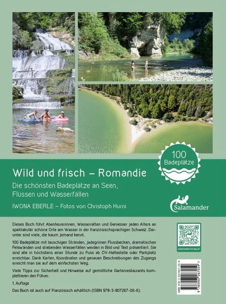 Dieses Buch führt Abenteurerinnen, Wasserratten und Geniesser jeden Alters an spektakulär schöne Orte am Wasser in der französischsprachigen Schweiz. Darunter sind viele, die kaum jemand kennt. 100 Badeplätze mit lauschigen Stränden, jadegrünen Flussbecken, dramatischen Felswänden und stiebenden Wasserfällen werden in Bild und Text präsentiert. Sie sind alle in höchstens einer Stunde zu Fuss ab ÖV-Haltestelle oder Parkplatz erreichbar. Dank Karten, Koordinaten und genauen Beschreibungen des Zugangs erreicht man sie auf dem einfachsten Weg. Viele Tipps zur Sicherheit und Hinweise auf gemütliche Gartenrestaurants komplettieren den Führer. Das Buch ist auch auf Französisch erhältlich (ISBN 978-3-907267-06-6).