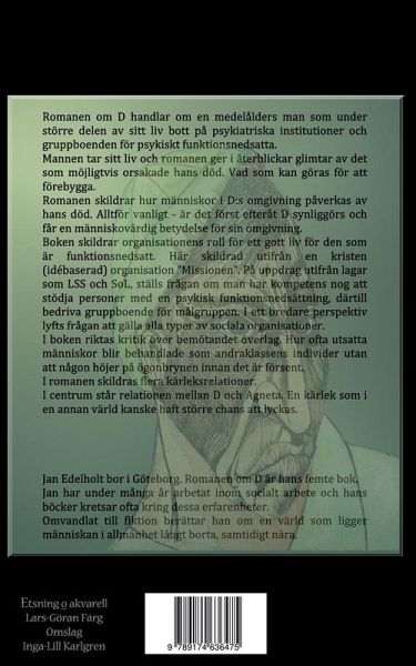 Romanen om D handlar om en medelålders man som under större delen av sitt liv bott på psykiatriska institutioner och gruppboenden för psykiskt funktionsnedsatta. Mannen tar sitt liv och romanen ger i återblickar glimtar av det som möjligtvis orsakade hans död. Vad som kan göras för att förebygga. Romanen skildrar hur människor i Ds omgivning påverkas av hans död. Alltför vanligt - är det först efteråt D synliggörs och får en människovärdig betydelse för sin omgivning. Boken skildrar organisationens roll för ett gott liv för den som är funktionsnedsatt. Här skildrad utifrån en kristen (idébaserad) organisation Missionen. På uppdrag utifrån lagar som LSS och SoL, ställs frågan om man har kompetens nog att stödja personer med en psykisk funktionsnedsättning, därtill bedriva gruppboende för målgruppen. I ett bredare perspektiv lyfts frågan att gälla alla typer av sociala organisationer. I boken riktas kritik över bemötandet överlag. Hur ofta utsatta människor blir behandlade som andraklassens individer utan att någon höjer på ögonbrynen innan det är försent. I romanen skildras flera kärleksrelationer. I centrum står relationen mellan D och Agneta. En kärlek som i en annan värld kanske haft större chans att lyckas