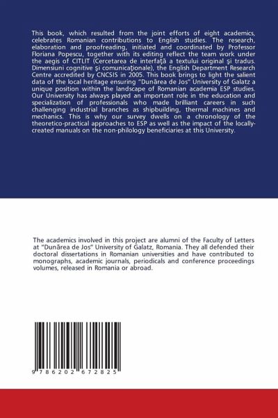 This book, which resulted from the joint efforts of eight academics, celebrates Romanian contributions to English studies. The research, elaboration and proofreading, initiated and coordinated by Professor Floriana Popescu, together with its editing reflect the team work under the aegis of CITLIT (Cercetarea de interfata a textului original si tradus. Dimensiuni cognitive si comunicationale), the English Department Research Centre accredited by CNCSIS in 2005. This book brings to light the salient data of the local heritage ensuring "Dunarea de Jos" University of Galatz a unique position within the landscape of Romanian academia ESP studies. Our University has always played an important role in the education and specialization of professionals who made brilliant careers in such challenging industrial branches as shipbuilding, thermal machines and mechanics. This is why our survey dwells on a chronology of the theoretico-practical approaches to ESP as well as the impact of the locally-created manuals on the non-philology beneficiaries at this University.