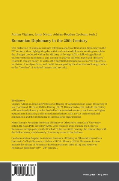 This collection of studies examines different aspects of Romanian diplomacy in the 20th century, thus highlighting the activity of various diplomats, seeking to explain the changes produced within the Ministry of Foreign Affairs following political transformations in Romania, and aiming to analyse different topic and "dossiers" related to foreign policy, as well as the negotiated perspectives of career diplomats, ministers of foreign affairs, and politicians regarding the directions of foreign policy or the "dossiers" of national interest and security.