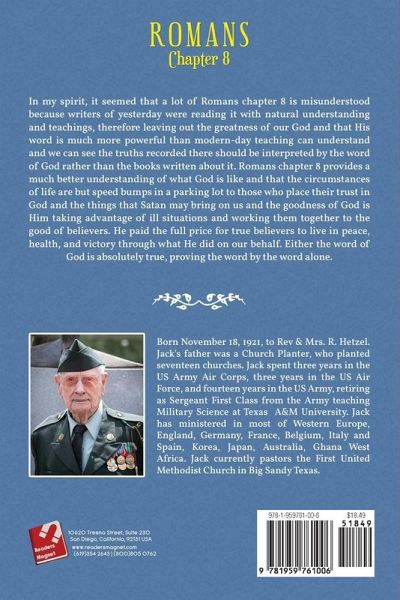 In my spirit it seemed that a lot of Romans chapter 8 is misunderstood because writers of yesterday were reading it with natural understanding and teachings, therefore leave out the greatness of our God and that His word is much more powerful than modern day teaching can understand and we can see the truths recorded there should be interpreted by the word of God rather than the books written about it. Romans chapter 8 provides a much better understanding of what God is like and that the circumstances of life are but speed bumps in a parking lot to those who place their trust in God and the things that Satan may bring on us and the goodness of God is Him taking advantage of ill situations and working them together to the good of believers. He paid the full price for true believers to live in peace, health and victory through what He did on our behalf. Either the word of God is absolutely true, proving the word by the word alone.