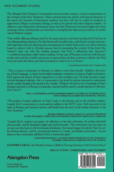 Like widely differing siblings raised by the same parents, each letter produced by Paul has its own distinguishing character. For the historically minded critic, each letter's unique traits provide important clues for detecting the circumstances in which Paul wrote it as well as what he hoped to achieve with it. Scholars assume that by examining the content of the letter (the "answer"), they can infer the readers' situation that Paul is addressing (the "question")--a method sometimes called "mirror reading." In the case of Romans, however, both the particular traits and the overall content are so unusual that scholars continue to debate why Paul wrote precisely this letter and what he hoped to achieve by it in Rome." So begins Leander Keck's seminal work on the New Testament book of Romans. Keck asserts that because Romans is part of the New Testament, we can compare it with the other letters ascribed to Paul, as well as with what Acts reports about his message and mission. But the first readers of Romans had only this letter; they could compare it only with what they may have heard about him. While this commentary does from time to time compare Romans with what Paul had said before, it concentrates on Romans itself; what Paul says in this text should not be conflated with--nor inflated into--what he thought comprehensively, though it is essential to understand that as well. "We do not really need another major commentary [on Romans] that loses us in the minutiae of word studies, literary parallels, sociological and rhetorical hypotheses; we have such in plenty. The Abingdon series, however, by its limited size, forces the contributor to focus on the primary task of the commentator: to clarify the meaning (intended or potential) of the words of the text and to provide some basic reflection on its/their continuing significance. And that is where Keck excels." - James D. G. Dunn, Review of Biblical Literature 04/2006.
