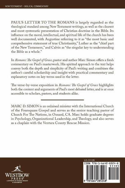 PAUL'S LETTER TO THE ROMANS is largely regarded as the theological standard among New Testament writings, as well as the clearest and most systematic presentation of Christian doctrine in the Bible. Its influence on the moral, intellectual, and spiritual life of the church has been well documented, with Augustine referring to it as "the most basic and comprehensive statement of true Christianity," Luther as the "chief part of the New Testament," and Calvin as "the singular key to understanding the Bible as a whole." In Romans: The Gospel of Grace, pastor and author Marc Simon offers a fresh commentary on Paul's masterwork. His spirited approach to the text helps convey both the depth and simplicity of Paul's writing and combines the author's careful scholarship and insight with practical commentary and explanatory notes on key terms used in the letter. The verse-by-verse exposition in Romans: The Gospel of Grace highlights both the content and arguments of Paul's most debated letter, and is at once accessible to scholars, pastors, and students alike.