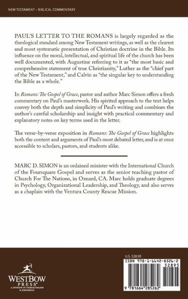 PAUL'S LETTER TO THE ROMANS is largely regarded as the theological standard among New Testament writings, as well as the clearest and most systematic presentation of Christian doctrine in the Bible. Its influence on the moral, intellectual, and spiritual life of the church has been well documented, with Augustine referring to it as "the most basic and comprehensive statement of true Christianity," Luther as the "chief part of the New Testament," and Calvin as "the singular key to understanding the Bible as a whole." In Romans: The Gospel of Grace, pastor and author Marc Simon offers a fresh commentary on Paul's masterwork. His spirited approach to the text helps convey both the depth and simplicity of Paul's writing and combines the author's careful scholarship and insight with practical commentary and explanatory notes on key terms used in the letter. The verse-by-verse exposition in Romans: The Gospel of Grace highlights both the content and arguments of Paul's most debated letter, and is at once accessible to scholars, pastors, and students alike.