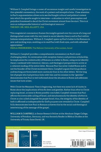 William S. Campbell provides a comprehensive commentary on Paul's most challenging letter. In conversation with reception history and previous scholarship, he emphasizes the contextuality of Romans as a letter to Rome, using social identity theory combined with historical, literary and theological perspectives to arrive at a coherent reading of the entire letter. Because Paul has never visited Rome and is not the founder of the Christ-movement there, Campbell argues that his guidance and teaching are formulated more cautiously than in his other letters. Yet the long list of people who had previous links with him and his mission to the 'gentiles' demonstrates that Paul is well-informed about the situation in Rome and addresses issues that have arisen. With Christ the Messianic Time is beginning, but there was some lack of clarity in Rome about the implications of this for Jews and gentiles. Rather than ethne in Christ replacing Israel, as some in Rome possibly concluded, Campbell stresses that Paul affirms the irrevocable calling of Israel, and that simultaneously the identity of ethne in Christ is also called alongside the people Israel; thus, the integrity of the identity of both is affirmed as indispensable for God's purpose now revealed in Christ. Campbell fully demonstrates how Paul in Romans achieves this by the social and theological intertwining of the message of the gospel.