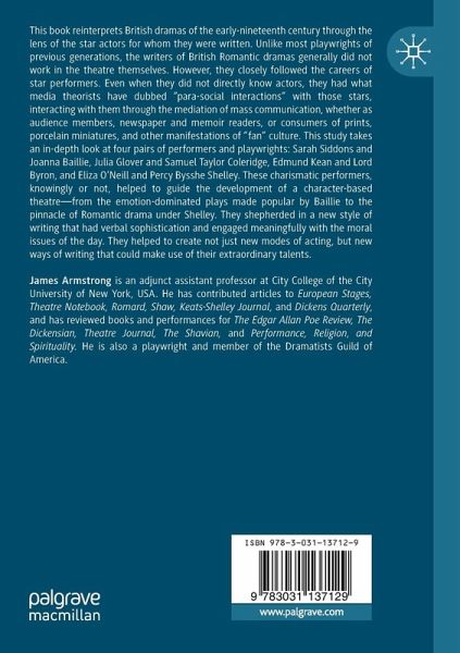 This book reinterprets British dramas of the early-nineteenth century through the lens of the star actors for whom they were written. Unlike most playwrights of previous generations, the writers of British Romantic dramas generally did not work in the theatre themselves. However, they closely followed the careers of star performers. Even when they did not directly know actors, they had what media theorists have dubbed "para-social interactions" with those stars, interacting with them through the mediation of mass communication, whether as audience members, newspaper and memoir readers, or consumers of prints, porcelain miniatures, and other manifestations of "fan" culture. This study takes an in-depth look at four pairs of performers and playwrights: Sarah Siddons and Joanna Baillie, Julia Glover and Samuel Taylor Coleridge, Edmund Kean and Lord Byron, and Eliza O'Neill and Percy Bysshe Shelley. These charismatic performers, knowingly or not, helped to guide the development of a character-based theatre-from the emotion-dominated plays made popular by Baillie to the pinnacle of Romantic drama under Shelley. They shepherded in a new style of writing that had verbal sophistication and engaged meaningfully with the moral issues of the day. They helped to create not just new modes of acting, but new ways of writing that could make use of their extraordinary talents.