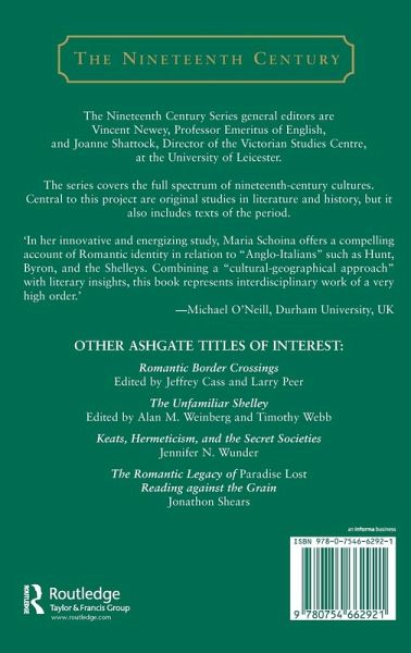 Focusing on key members of the Pisan Circle, Byron, the Shelleys, and Leigh Hunt, Maria Schoina explores configurations of identity and the acculturating practices of British expatriates in post-Napoleonic Italy. The problems involved in British Romanticism's relations to its European 'others' are her point of departure, as she argues that the emergence and mission of what Mary Shelley termed the 'Anglo-Italian' is inextricably linked to the social, political, economic, and cultural conditions of the age: the forging of the British identity in the midst of an expanding empire, the rise of the English middle class and the establishment of a competitive print culture, and the envisioning, by a group of male and female Romantic liberal intellectuals, of social and political reform. Schoina's emphasis on the political implications of the British Romantics' hyphenated self-representation results in fresh readings of the Pisan Circle's Italianate writings that move them away from interpretations focused on a purely aesthetic or poetic attachment to Italy to uncover their complex ideological underpinnings. Recognizing that Mary Shelley was instrumental in conceptualizing the Romantics' discourse of acculturation expands our understanding of this phenomenon, as does Schoina's convincing case for the importance of gender as a major determinant of Mary Shelley's construction of Anglo-Italianness.