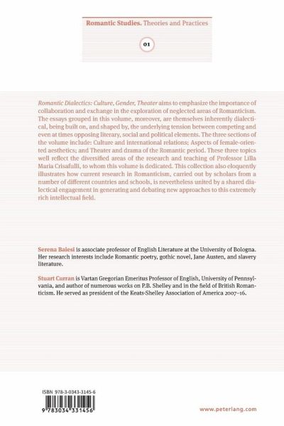 Keir Elam: Foreword: On the Dialectics of Literature and Life - Serena Baiesi/Stuart Curran: Introduction - Part I: Cultural Dialectics - Stuart Curran: Byron and Shelley: Becoming Italian - Jeffrey N. Cox: «For I will Teach [. . .] the Stones / To Rise against Earth's Tyrants»: Moving Beyond War in Byron's «War Cantos» - Peter Vassallo: Romantic Fabrications of Napoleon - Elena Spandri: Between Culture Shock and Franciscan Ecology: Wordsworth's Last Encounter with Italy - Nora Crook: «That Crabbed German»: Mary Shelley's Germanizing - Greg Kucich: The Place of Keats's Endymion in Times of Peril and among «Blear-Eyed Nations» - Part II: Dialectics of Gender - Gioia Angeletti: Outside the Love of Men: The Ladies of Llangollen, Anna Seward and Female Friendship - Carlotta Farese: Reading for Agency: The Literary Bildung of Fanny Price - Serena Baiesi: «I Will Tell my Story, and my Reader Shall Judge for Me»: Mary Shelley's Stories for The Keepsake - Part III: Dialectical Theatrical Modes - Catherine Burroughs: Women and Closet Drama - Michael Gamer: «And the Explosion Immediately Takes Place»: Romantic Tragedy and the End(s) of Melodrama - Franca Dellarosa: Translating Spaces: The Case of Paul and Virginia - Diego Saglia: Staging Strangeness in Charles Robert Maturin's Bertram - Notes on Contributors - Index