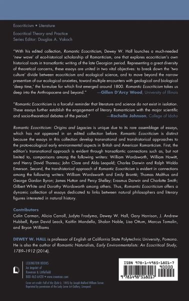 Introduction - Dewey W. Hall Chapter 1. Ecological Horology: The Nature of Time during the Romantic Period - Marcus Tomalin Chapter 2. Naturalists' Interpretations: Daffodils, Swallows, and a Floating Island - Dewey W. Hall Chapter 3. 'It cannot be a sin to seek to save an earth-born being': Radical Ecotheology in Byron's Heaven and Earth - J. Andrew Hubbell Chapter 4. Process and Presence: Geological Influence and Innovation in Shelley's 'Mont Blanc' - Bryon Williams Chapter 5. 'Perpetual Analogies' and 'Occult Harmonies': Ralph Waldo Emerson's Ecological Selves - Kaitlin Mondello Chapter 6. An Uncertain Spirit of an Unstable Place: Frankenstein in the Anthropocene - Shalon Noble Chapter 7. Wild West and Western Wildness: A Transatlantic Perspective - Jude Frodyma Chapter 8. Ecocentering the Self: William Howitt, Thoreau, and the Environmental Imagination - Ryan David Leack Chapter 9. Toward a Romantic Poetics of Acknowledgement: Wordsworth, Clare, and Aldo Leopold's 'Land Ethi