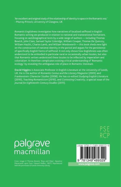 Romantic Englishness investigates how narratives of localised selfhood in English Romantic writing are produced in relation to national and transnational formations. This book focuses on autobiographical texts by authors such as John Clare, Samuel Taylor Coleridge, William Hazlitt, Charles Lamb, and William Wordsworth.