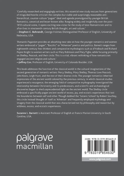 This book addresses the function of the classical world in the cultural imaginations of the second generation of romantic writers: Percy Shelley, Mary Shelley, Thomas Love Peacock, John Keats, Leigh Hunt, and the rest of their diverse circle. The younger romantics inherited impressions of the ancient world colored by the previous century, in which classical studies experienced a resurgence, the emerging field of comparative mythography investigated the relationship between Christianity and its predecessors, and scientific and archaeological discoveries began to shed unprecedented light on the ancient world. The Shelley circle embraced a specifically pagan ancient world of excess, joy, and ecstatic experiences that test the boundaries between self and other. Though dubbed the "Satanic School" by Robert Southey, this circle instead thought of itself as "Athenian" and frequently employed mythology and imagery from the classical world that was characterized not by philosophy and reason butby wildness, excess, and ecstatic experiences.