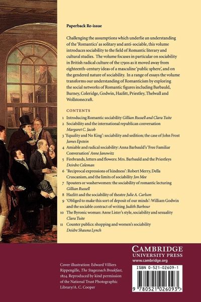 Acknowledgements; 1. Introducing Romantic sociability Gillian Russell and Clara Tuite; 2. Sociability and the international republican conversation Margaret C. Jacob; 3. 'Equality and no king': sociability and sedition; the case of John Frost James Epstein; 4. Amiable and radical sociability: Anna Barbauld's 'free familiar conversation' Anne Janowitz; 5. Firebrands, letters and flowers: Mrs. Barbauld and the Priestleys Deirdre Coleman; 6. 'Reciprocal expressions of kindness': Robert Merry, the Della Cruscans, and the limits of Romantic sociability Jon Mee; 7. Spouters of washerwomen: the sociability of Romantic lecturing Gillian Russell; 8. Hazlitt and the sociability of theatre Julie A. Carlson; 9. 'Obliged to make this sort of deposit of our minds': William Godwin and the sociable contract of writing Judith Barbour; 10. The Byronic woman: Anne Lister's style, sociability and sexuality Clara Tuite; 11. Counter publics: shopping and women's sociability Deidre Shauna Lynch; Bibliography; Index.