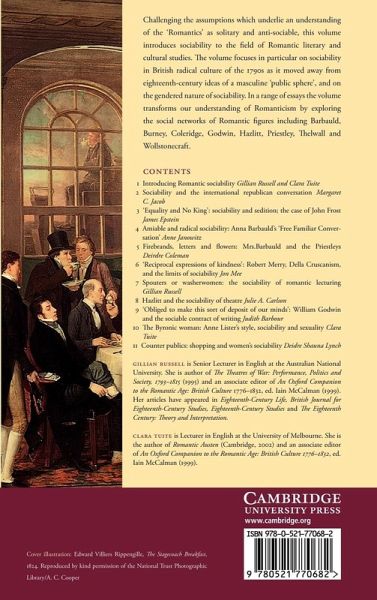 Challenging the assumptions which underlie an understanding of the 'Romantics' as solitary and anti-sociable, and Romanticism as representing the rejection of Enlightenment sociability, this 2002 volume introduces sociability to the field of Romantic literary and cultural studies. The volume engages with Jurgen Habermas' model of the 'public sphere' which emphasizes the coffee-house and club as models of an older, masculine eighteenth-century sociability, and focuses on the changing nature of sociability in British radical culture of the 1790s and on the gendered nature of sociability. In a range of essays which examine modes of sociability as diverse as circles of sedition, international republicanism, Dissenting culture, Romantic lecturing, theatre, and shopping, the volume transforms our understanding of Romanticism by exploring the social networks of such central Romantic figures as Anna Barbauld, Frances Burney, Samuel Taylor Coleridge, William Godwin, William Hazlitt, Anne Lister, Robert Merry, Joseph Priestley, John Thelwall and Mary Wollstonecraft.