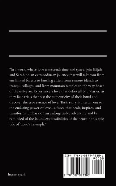 "In a world where love transcends time and space, join Elijah and Sarah on an extraordinary journey that will take you from enchanted forests to bustling cities, from remote islands to tranquil villages, and from mountain temples to the very heart of the universe. Experience a love that defies all boundaries, as they face trials that test the authenticity of their bond and discover the true essence of love. Their story is a testament to the enduring power of love-a force that heals, inspires, and transforms. Embark on an unforgettable adventure and be reminded of the boundless possibilities of the heart in this epic tale of 'Love's Triumph.'"