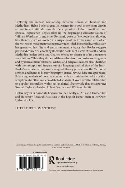 Exploring the intense relationship between Romantic literature and Methodism, Helen Boyles argues that writers from both movements display an ambivalent attitude towards the expression of deep emotional and spiritual experience. Boyles takes up the disparaging characterization of William Wordsworth and other Romantic poets as 'Methodistical,' showi