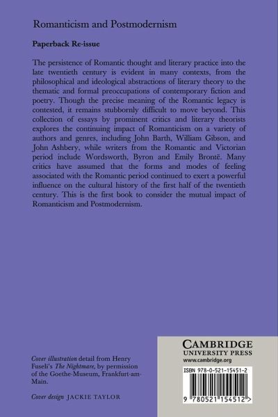 The persistence of Romantic thought and literary practice into the late twentieth century is evident in many contexts, from the philosophical and ideological abstractions of literary theory to the thematic and formal preoccupations of contemporary fiction and poetry. Though the precise meaning of the Romantic legacy is contested, it remains stubbornly difficult to move beyond. This collection of essays by prominent critics and literary theorists was first published in 1999, and explores the continuing impact of Romanticism on a variety of authors and genres, including John Barth, William Gibson, and John Ashbery, while writers from the Romantic and Victorian period include Wordsworth, Byron and Emily Brontë. Many critics have assumed that the forms and modes of feeling associated with the Romantic period continued to influence the cultural history of the the first half of the twentieth century. This was the first book to consider the mutual impact of postmodernism and Romanticism.