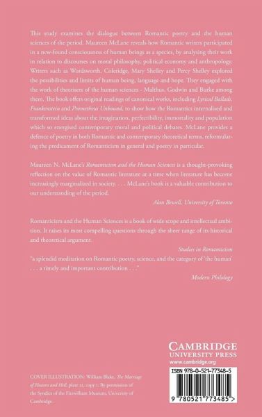 This study, published in 2000, examines the dialogue between Romantic poetry and the human sciences of the period. Maureen McLane reveals how Romantic writers participated in a new-found consciousness of human beings as a species, by analysing their work in relation to discourses on moral philosophy, political economy and anthropology. Writers such as Wordsworth, Coleridge, Mary Shelley and Percy Shelley explored the possibilities and limits of human being, language and hope. They engaged with the work of theorisers of the human sciences - Malthus, Godwin and Burke among them. The book offers original readings of canonical works, including Lyrical Ballads, Frankenstein and Prometheus Unbound, to show how the Romantics internalised and transformed ideas about the imagination, perfectibility, immortality and population which so energised contemporary moral and political debates. McLane provides a defence of poetry in both Romantic and contemporary theoretical terms, reformulating the predicament of Romanticism in general and poetry in particular.