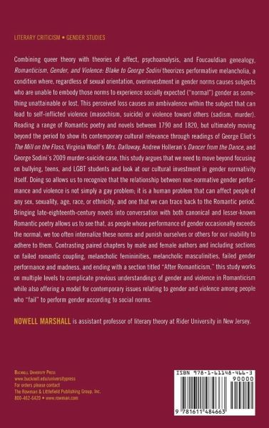 Introduction Gender Normativity, Failure, and Violence from Romanticism to George Sodini Section One: Romantic Coupling, Failure, and Melancholia Social Bond(age)s in Visions of the Daughters of Albion Rethinking Burney, Gender, and Violence: Camilla and the Masochistic Contract Section Two: Melancholic Femininities "Corrupt Nature": Performative Melancholia and Violence in Zofloya Siren Songs: Maggie Tulliver, Music, and Performative Melancholia in The Mill on the Floss Section Three: Melancholic Masculinities Monstrosity and Failed Masculinity in The Giaour Competition and Melancholic Masculinity in Caleb Williams Section Four: Abandonment, Performative Melancholia, and Madness Performative Melancholia and the Gothic Body in Wordsworth and Shelley Amelia Opie's The Father and Daughter: Female Masochism and Male Madness Section Five: After Romanticism Refusing Butler's Binary: Bisexuality and Performative Melancholia in Mrs. Dalloway Heternormativity and Performative Melancholia in Dancer from the Dance