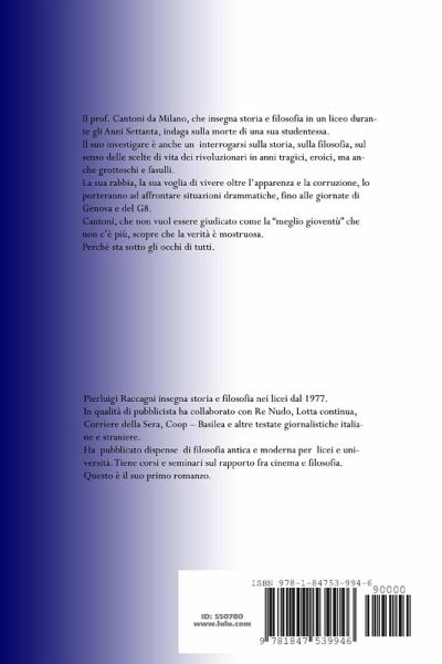 Il prof. Cantoni da Milano, che insegna storia e filosofia in un liceo durante gli Anni Settanta, indaga sulla morte di una sua studentessa. Il suo investigare è anche un interrogarsi sulla storia, sulla filosofia, sul senso delle scelte di vita dei rivoluzionari in anni tragici, eroici, ma anche grotteschi e fasulli. La sua rabbia, la sua voglia di vivere oltre l'apparenza e la corruzione, lo porteranno ad affrontare situazioni drammatiche, fino alle giornate di Genova e del G8. Cantoni, che non vuol essere giudicato come la "meglio gioventù" che non c'è più, scopre che la verità è mostruosa. Perché sta sotto gli occhi di tutti. In vendita, ancora, nelle seguenti librerie a Milano: Libreria del Giallo, via Peschiera 11, Libreria Centofiori via Indipendenza, Edicola - Libreria Piazza Diocleziano. Libreria Opicini a Levanto. PER IL SEGUITO DEL ROMANZO SCARICA GRATUITO LA VIE EN ROUGE:NELLE LIBRERIE SOPRACITATE E IN TUTTE LE LIBRERIE DISTRIBUZIONE LULU - DA GENNAIO