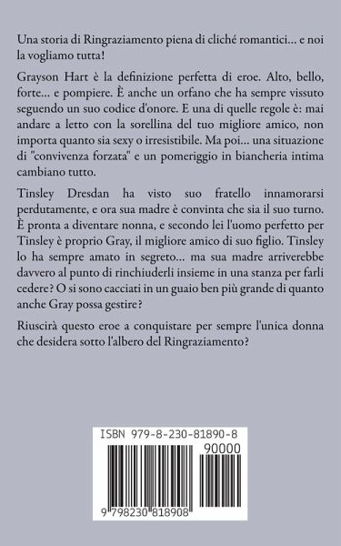 Una storia di Ringraziamento piena di cliché romantici... e noi la vogliamo tutta! Grayson Hart è la definizione perfetta di eroe. Alto, bello, forte... e pompiere. È anche un orfano che ha sempre vissuto seguendo un suo codice d'onore. E una di quelle regole è: mai andare a letto con la sorellina del tuo migliore amico, non importa quanto sia sexy o irresistibile. Ma poi... una situazione di "convivenza forzata" e un pomeriggio in biancheria intima cambiano tutto. Tinsley Dresdan ha visto suo fratello innamorarsi perdutamente, e ora sua madre è convinta che sia il suo turno. È pronta a diventare nonna, e secondo lei l'uomo perfetto per Tinsley è proprio Gray, il migliore amico di suo figlio. Tinsley lo ha sempre amato in segreto... ma sua madre arriverebbe davvero al punto di rinchiuderli insieme in una stanza per farli cedere? O si sono cacciati in un guaio ben più grande di quanto anche Gray possa gestire? Riuscirà questo eroe a conquistare per sempre l'unica donna che desidera sotto l'albero del Ringraziamento?