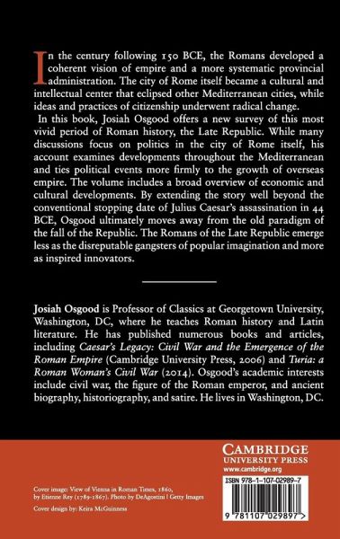 In the century following 150 BCE, the Romans developed a coherent vision of empire and a more systematic provincial administration. The city of Rome itself became a cultural and intellectual center that eclipsed other Mediterranean cities, while ideas and practices of citizenship underwent radical change. In this book, Josiah Osgood offers a new survey of this most vivid period of Roman history, the Late Republic. While many discussions focus on politics in the city of Rome itself, his account examines developments throughout the Mediterranean and ties political events more firmly to the growth of overseas empire. The volume includes a broad overview of economic and cultural developments. By extending the story well beyond the conventional stopping date of Julius Caesar's assassination in 44 BCE, Osgood ultimately moves away from the old paradigm of the fall of the Republic. The Romans of the Late Republic emerge less as the disreputable gangsters of popular imagination and more as inspired innovators.