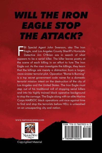 "Rome Is Burning" is secret government code for a potential terrorist attack in the U.S. The City of Los Angeles is in danger, and no one knows it. Special Agent John Swenson, aka The Iron Eagle, and Sheriff's Homicide Detective Jim O'Brian have been in search of a serial killer with a twist: a terrorist plot of tremendous proportions. A disgraced Marine Corps Colonel has hatched a plan with her subordinates to destroy the city of Los Angeles and kill millions of its citizens. John Swenson, also a highly decorated former Marine Corps MARSOC black operative, must step out of his role as FBI agent and back into his military training to stop what will be the worst terrorist attack in U.S. history. Swenson and O'Brian engage with Swenson's retired unit to attempt to stop the devastation. With every turn in the investigation and hunt for the terrorists, a deeper anti-government plot is uncovered, and the only thing standing in the way of death and destruction for a city and a nation is The Iron Eagle and his team of black operatives.