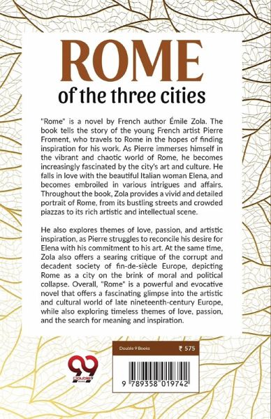 "Rome" is a novel by French author Émile Zola. The book tells the story of the young French artist Pierre Froment, who travels to Rome in the hopes of finding inspiration for his work. As Pierre immerses himself in the vibrant and chaotic world of Rome, he becomes increasingly fascinated by the city's art and culture. He falls in love with the beautiful Italian woman Elena, and becomes embroiled in various intrigues and affairs. Throughout the book, Zola provides a vivid and detailed portrait of Rome, from its bustling streets and crowded piazzas to its rich artistic and intellectual scene. He also explores themes of love, passion, and artistic inspiration, as Pierre struggles to reconcile his desire for Elena with his commitment to his art. At the same time, Zola also offers a searing critique of the corrupt and decadent society of fin-de-siècle Europe, depicting Rome as a city on the brink of moral and political collapse. Overall, "Rome" is a powerful and evocative novel that offers a fascinating glimpse into the artistic and cultural world of late nineteenth-century Europe, while also exploring timeless themes of love, passion, and the search for meaning and inspiration.
