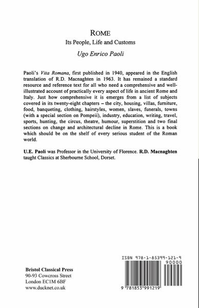 Originally published over 50 years ago as "Vita Romana", this work covers every aspect of Roman life: the architecture and layout of the city; the home, clothes, travel, sports and pastimes; the role of women; industry, education, law, culture and medicine. It covers the entire history of Rome to the invasions of the Goths and the Vandals, and then assesses Rome's subsequent architectural decay and recent restoration.