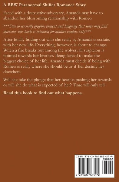 A BBW Paranormal Shifter Romance Story Faced with a destructive adversary, Amanda may have to abandon her blossoming relationship with Romeo. ***Due to sexually graphic content and language that some may find offensive, this book is intended for mature readers only*** After finally finding out who she really is, Amanda is ecstatic with her new life. Everything, however, is about to change. When a fire breaks out among the wolves, all suspicion is pointed towards her brother. Being forced to make the biggest choice of her life, Amanda must decide if being with Romeo is really where she should be or if her destiny lies elsewhere. Will she take the plunge that her heart is pushing her towards or will she do what is expected of her? Time will only tell. Read this book to find out what happens.