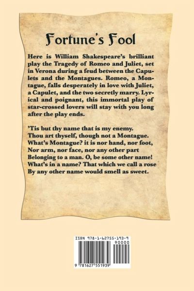 Fortune's Fool Here is William Shakespeare's brilliant play the Tragedy of Romeo and Juliet, set in Verona during a feud between the Capulets and the Montagues. Romeo, a Montague, falls desperately in love with Juliet, a Capulet, and the two secretly marry. Lyrical and poignant, this immortal play of star-crossed lovers will stay with you long after the play ends. 'Tis but thy name that is my enemy. Thou art thyself, though not a Montague. What's Montague? it is nor hand, nor foot, Nor arm, nor face, nor any other part Belonging to a man. O, be some other name! What's in a name? That which we call a rose By any other name would smell as sweet.