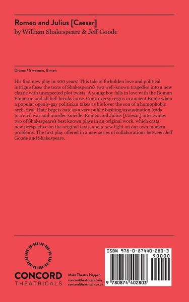 All groups / Areas / Drama / 8m, 5f / Running time: 2 hours His first new play in 400 years! This tale of forbidden love and political intrigue fuses the texts of Shakespeare's two well-known tragedies into a new classic with unexpected plot twists. A young boy falls in love with the Roman Emperor, and all hell breaks loose. Controversy reigns in ancient Rome when a popular openly-gay politician takes as his lover the son of a homophobic arch-rival. Hate begets hate as a very public bashing/assassination leads to civil war and murder-suicide. Romeo and Julius Caesar intertwines two of Shakespeare's best known plays in an original work, which casts new perspective on the original texts, and a new light on our own modern problems. The first play offered in a new series of collaborations between Jeff Goode and Shakespeare.