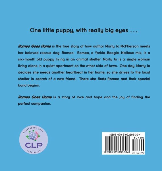 One little puppy, with really big eyes ... Romeo Goes Home is the true story of how author Marty Jo McPherson meets her beloved rescue dog, Romeo. Romeo, a Yorkie-Beagle-Maltese mix, is a six-month old puppy living in an animal shelter. Marty Jo is a single woman living alone in a quiet apartment on the other side of town. One day, Marty Jo decides she needs another heartbeat in her home, so she drives to the local shelter in search of a new friend. There she finds Romeo and their special bond begins. Romeo Goes Home is a story of love and hope and the joy of finding the perfect companion.