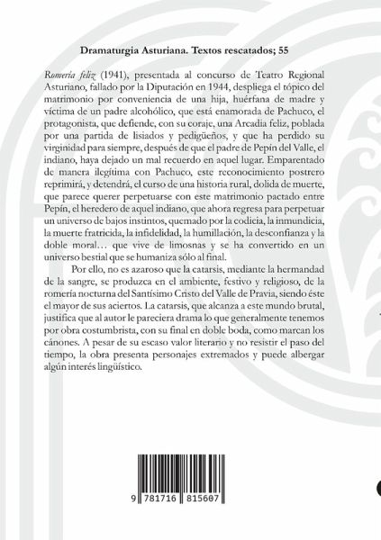 "Romería feliz" (1941), presentada al concurso de Teatro Regional Asturiano, fallado por la Diputación en 1944, despliega el tópico del matrimonio por conveniencia de una hija, huérfana de madre y víctima de un padre alcohólico, que está enamorada de Pachuco, el protagonista, que defiende, con su coraje, una Arcadia feliz, poblada por una partida de lisiados y pedigüeños, y que ha perdido su virginidad para siempre, después de que el padre de Pepín del Valle, el indiano, haya dejado un mal recuerdo en aquel lugar. Emparentado de manera ilegítima con Pachuco, este reconocimiento postrero reprimirá, y detendrá, el curso de una historia rural, dolida de muerte, que parece querer perpetuarse con este matrimonio pactado entre Pepín, el heredero de aquel indiano, que ahora regresa para perpetuar un universo de bajos instintos, quemado por la codicia, la inmundicia, la muerte fratricida, la infidelidad, la humillación, la desconfianza y la doble moral... que vive de limosnas y se ha convertido en un universo bestial que se humaniza sólo al final. Por ello, no es azaroso que la catarsis, mediante la hermandad de la sangre, se produzca en el ambiente, festivo y religioso, de la romería nocturna del Santísimo Cristo del Valle de Pravia, siendo éste el mayor de sus aciertos. La catarsis, que alcanza a este mundo brutal, justifica que al autor le pareciera drama lo que generalmente tenemos por obra costumbrista, con su final en doble boda, como marcan los cánones. A pesar de su escaso valor literario y no resistir el paso del tiempo, la obra presenta personajes extremados y puede albergar algún interés lingüístico.