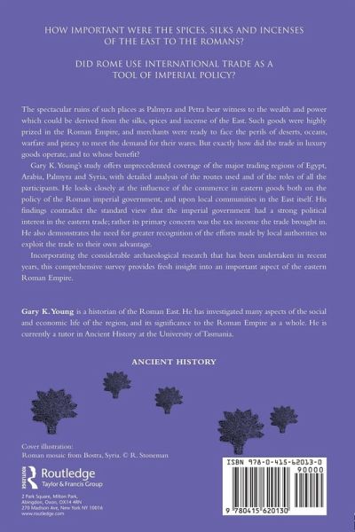 The spectacular ruins of such places as Palmyra and Petra bear witness to the wealth and power which could be derived from the silks, spices and incense of the east. Such goods were highly prized in the Roman Empire, and merchants were ready to face the perils of deserts, oceans, warfare and piracy to meet the demand for their wares. But exactly how did the trade in luxury goods operate, and to whose benefit? Gary K. Young's study offers unprecedented coverage of the major trading regions of Egypt, Arabia, Palmyra, and Syria, with detailed analysis of the routes used and of the roles of all the participants. He looks closely at the influence of the commerce in eastern goods both on the policy of the Roman imperial government, and upon local communities in the East itself. His findings contradict the standard view that the imperial government had a strong political interest in the eastern trade; rather its primary concern was the tax income the trade brought in. He also demonstrates the need for greater recognition of the efforts made by local authorities to exploit the trade to their own advantage. Incorporating the considerable archaeological research that has been undertaken in recent years, this comprehensive survey provides fresh insight into an important aspect of the eastern Roman Empire.