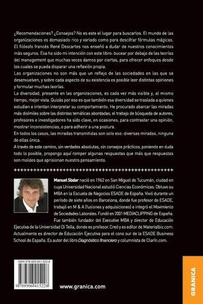 ¿Recomendaciones? ¿Consejos? No es este el lugar para buscarlos. El mundo de las organizaciones es demasiado rico y variado como para descifrar fórmulas mágicas. El filósofo francés René Descartes nos enseñó a dudar de nuestros conocimientos más seguros. Esa ha sido mi intención con este libro: bucear por debajo de las teorías del management que muchas veces damos por ciertas, para ofrecer enfoques desde los cuales se pueda disparar una reflexión propia. Las organizaciones no son más que un reflejo de las sociedades en las que se desenvuelven, y sobre cada aspecto de su existencia es posible leer distintas opiniones y formular muchas teorías. La diversidad, presente en las organizaciones, es cada vez más visible y, al mismo tiempo, mejor vista. Quizás por eso es que también esa diversidad se traslada a quienes estudian e intentan interpretar su comportamiento. He procurado abarcar las miradas más disímiles sobre las distintas temáticas abordadas; el trabajo de búsqueda de autores, profesores e investigadores ha sido clave, en ocasiones, para contrastar una opinión, mostrar inconsistencias, o para adherir a una postura. En todos los casos, las miradas transmitidas son sólo eso: diversas miradas, ninguna de ellas única. A través de este camino, sin verdades absolutas, sin consejos prácticos, poniendo en duda todo lo posible, propongo aquí romper algunas respuestas que más que respuesta son moldes que aprisionan nuestro pensamiento. Manuel Sbdar nació en 1962 en San Miguel de Tucumán, ciudad en cuya Universidad Nacional estudió Ciencias Económicas. Obtuvo su MBA en la Escuela de Negocios ESADE de España. Vivió durante un período de siete años en Barcelona, donde fue profesor de ESADE, trabajó en M & A (fusiones y adquisiciones) e integró el Movimiento de Sociedades Laborales. Fundó en 2001 MEDIACLIPPING de España. Fue también fundador del Executive MBA y director de Educación Ejecutiva de la Universidad Di Tella, donde es profesor. Creó y es editor de Materialbiz.com. Actualmente es director de Educación Ejecutiva para el cono sur de la ESADE Business School de España. Es autor del libro Diagnóstico financiero y columnista de Clarín.com