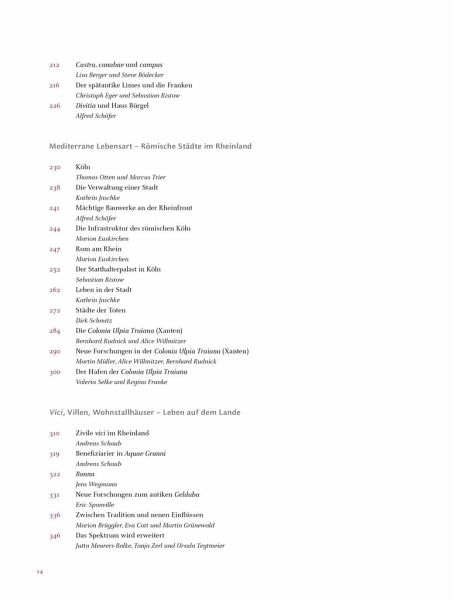 Das römische Rheinland - Vom Werden der Provinz Niedergermanien Roms Adler am Rhein - Der Niedergermanische Limes als nordwestliche Grenze des römischen Imperiums Mediterrane Lebensart - Die römischen Städte Köln und Xanten Vici, Villen, Wohnstallhäuser - Leben auf dem Lande Leben mit Rom - Römischer Einfluss und germanische Tradition in der Germania magna
