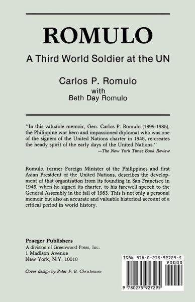 In this valuable memoir, Gen. Carlos P. Romulo (1899-1985), the Philippine war hero and impassioned diplomat who was one of the signers of the United Nations Charter in 1945, re-creates the heady spirit of the early days of the United Nations. . . . A leading spokesman for newly independent third world countries, he lobbied successfully to get the right of colonial countries to independence included in the Charter. The New York Times Book Review In his fascinating volume, Carlos P. Romulo, retired Foreign Minister of the Philippines and first Asian President of the United Nations, describes the development of that organization from its founding in San Francisco in 1945, when he signed its charter, to his farewell speech to the General Assembly in the fall of 1983. Related in the form of personal memories and impressions, the facts and dates in his narrative have been thoroughly checked and corroborated by his wife and co-author so that they blend integrally with the broader fabric of United Nations history. Not only is this a personal memoir but also an accurate and valuable historical account of a critical period in the history of the world. The volume will certainly be of immense interest to readers concerned with the conduct of international diplomacy, East-West relations, or relations with Third World countries.