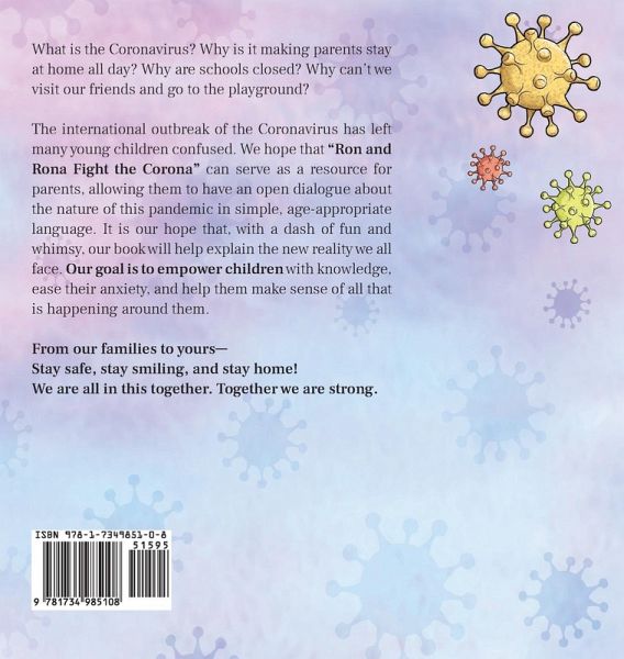 The international outbreak of the Coronavirus has left many young children confused. We hope that "Ron and Rona Fight the Corona" can serve as a resource for parents, allowing them to have an open dialogue about the nature of this pandemic in simple, age-appropriate language. It is our hope that, with a dash of fun and whimsy, our book will help explain the new reality we all face. Our goal is to empower children with knowledge, ease their anxiety, and help them make sense of all that is happening around them.